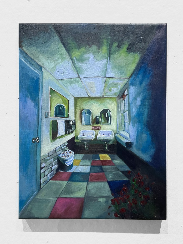 During the ideation of this project, I ping-ponged between wanting to create a surrealist landscape that captured ideas of warped spaces that are simultaneously alien and also so familiar as to instill a sense of roaring nostalgia, and the actual process of doing so. I wanted to reference a space that inspired me, and also was realistic to create in the timeframe that we were given. This restraint pushed me to think more about the look and techniques I would use in the piece. I landed on a photo I had taken in the Arts and Scraps bathroom a few months ago. That space has always been one that I found to be calming and satisfyingly colorful. It reminds me of my preschool years and somehow is a space that, though I do not visit often I think about frequently.