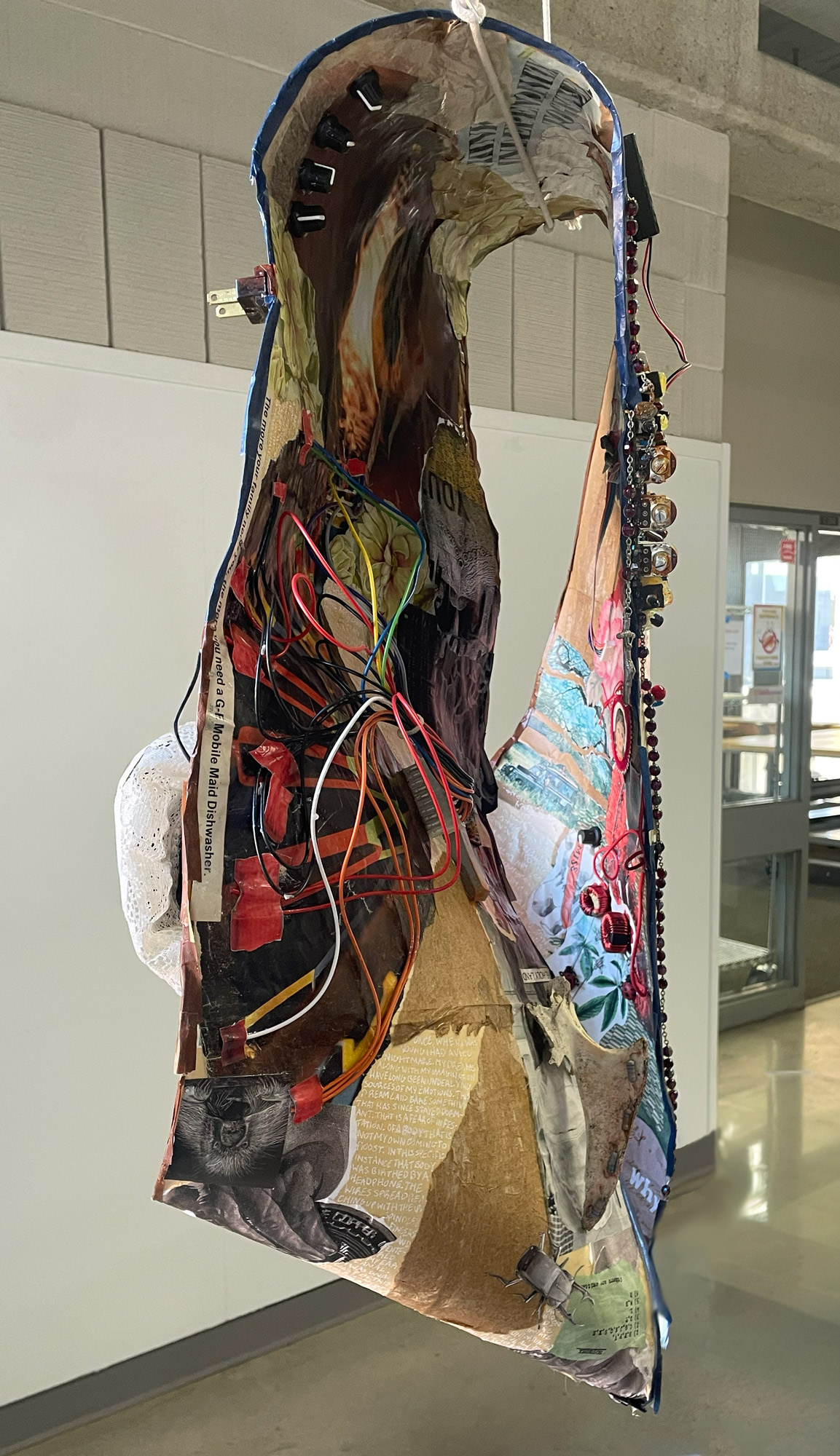 In my piece Coded I wanted to tackle personal ideas connecting the body to machinery, and through that our ideas and preconceived notions about both. I used two different mechanisms to deliver this idea. One was the aspect that is most apparent which is the fact this piece is a collage; second is that the shape is a mobius strip. I chose the mobius strip as my vessel as it is a shape that has neither an end, beginning, one side or another. It is simultaneously both and neither of two things in a three dimensional space and is a beautiful phenomenon that is perfect for connecting two incredibly opposing ideas. Collaging this piece is a harder choice to put into words, aesthetically I wanted to have a certain air around the piece, and use items that were already in my possession collected through many months of scouring secondhand sources for ephemera. The specificities of such are an amalgamation of mismatched trash that is both my own and that from other people. Old broken items that are now unloved as they do not serve a purpose anymore, as well as perfectly good materials discarded as they have now become obsolete or out of fashion.