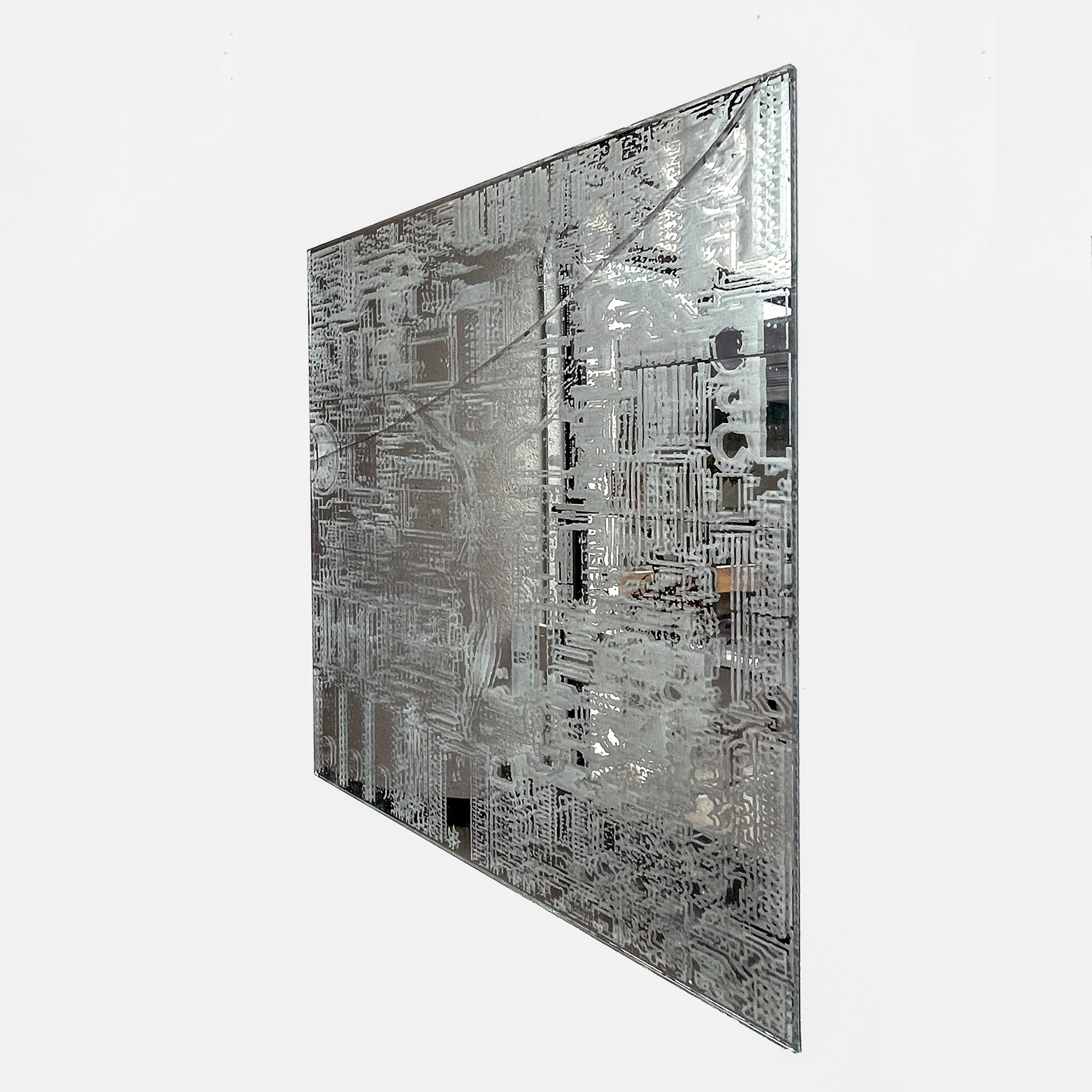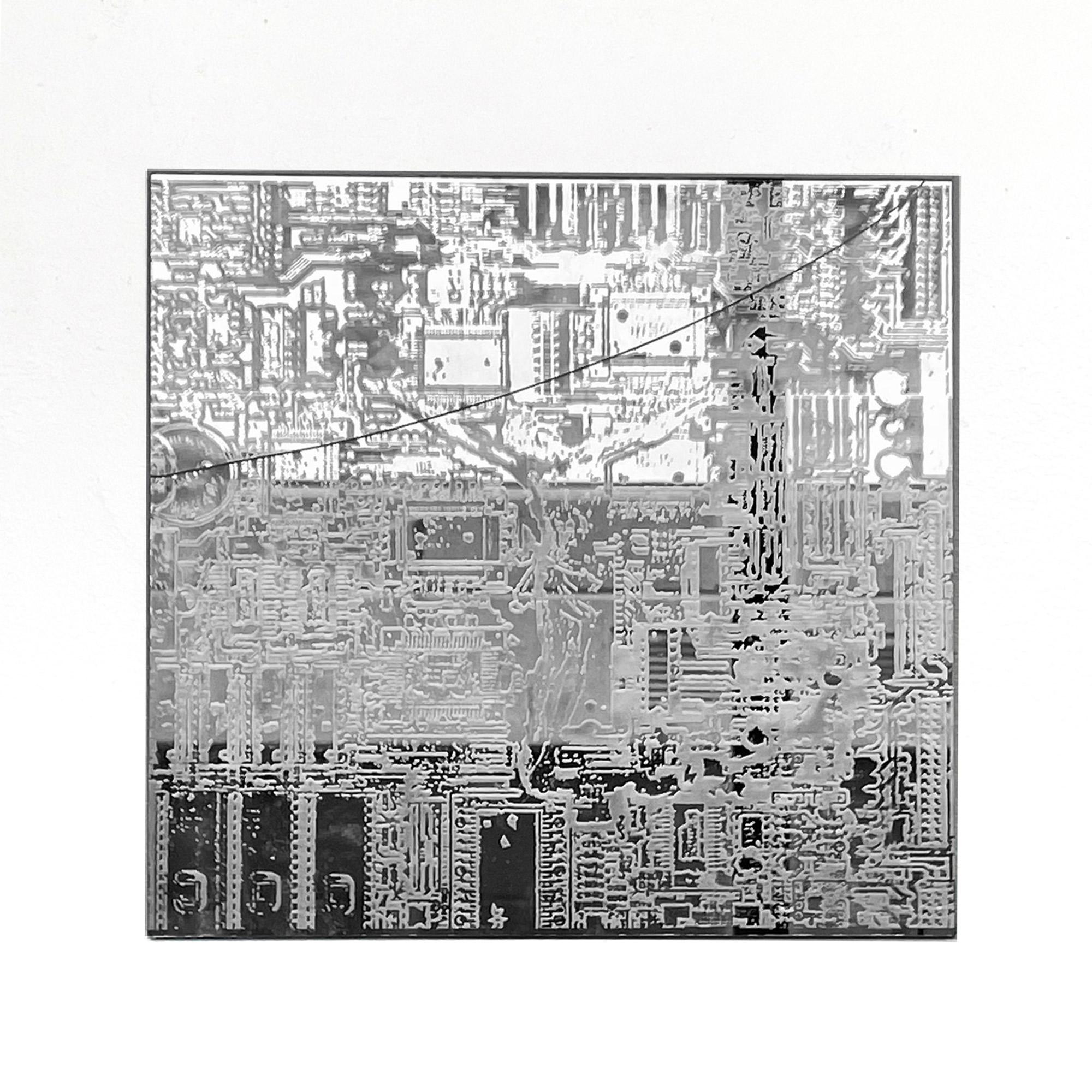 I enjoy working representationally, and having it so that my work is not so much something to decode, but to be experienced. Performance, and experimental installations have fully enthralled me as of recently. It is a practice I plan to pursue more in the future, this project is simply a way to get my feet wet. I’ve never done anything remotely near interactive art, even if this is a base and incredibly simple version of it. I want this piece to feel like a unique perspective for everyone who comes across it. For this piece in particular I chose a mirror as that is the most often viewed way we can see ourselves from our own perspective. Then overlaid with the motherboard parts will be obscured and foggy. Lending to a moment of hesitation before the viewer is fully able to realize the piece. Almost like focusing and unfocusing a camera lens. There is a crack, unintended but not unwelcome. Through the trial and error that came from learning a new technique it was hard to find a balance between the fragility of the glass and the aggressive heat of the laser. I had to pause the program at every inch to allow for the surface to cool and heat to dissipate but even with those precautions the glass cracked. I could say I was hoping it would crack or that it lends another layer of depth to the meaning but it doesn’t, it’s simply an error and byproduct of experimentation and pushing a tool to its limits.